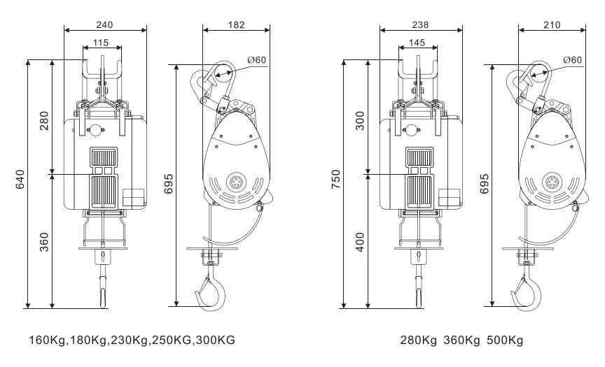 | 额定起重 | 160kg/180kg/230kg/250kg/300kg | 280kg/360kg | 500kg | |